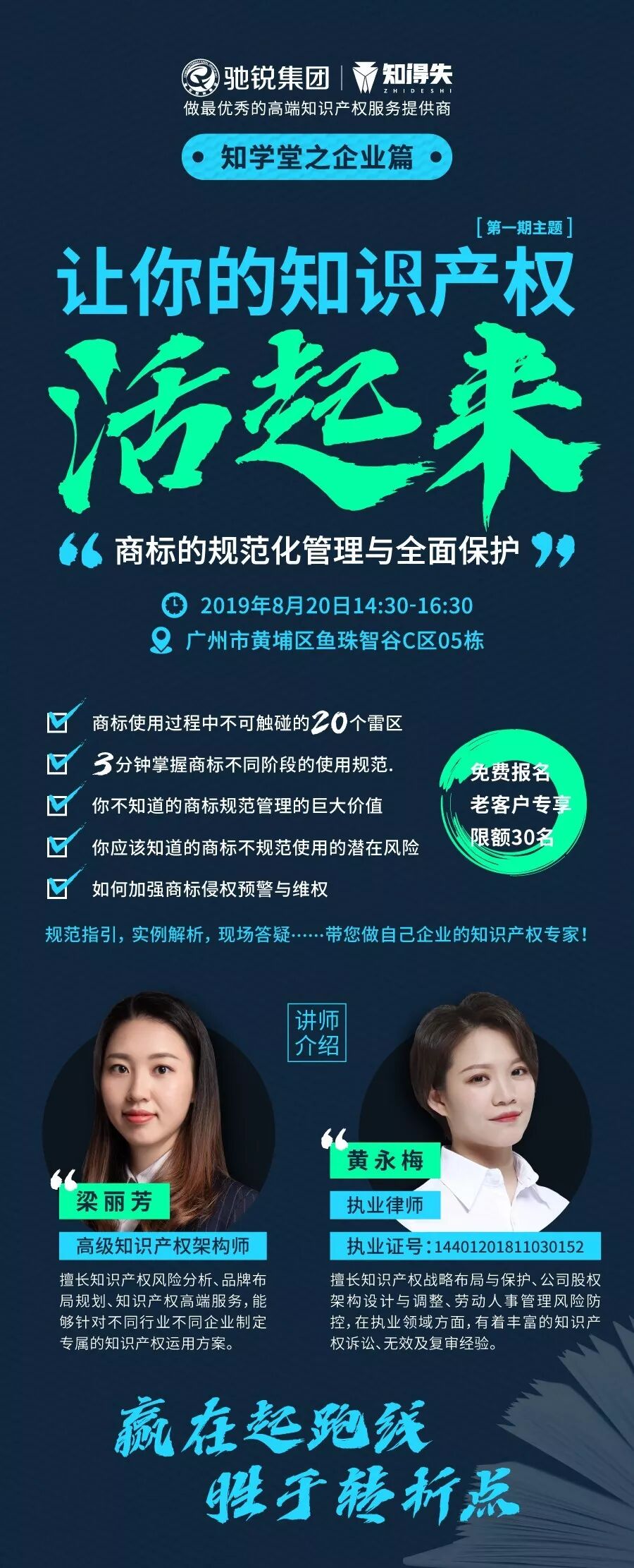 2019年8月20日,驰锐集团举办了一场以“让你的知识产权活起来——商标的规范化管理与全面保护”为主题的免费精品小班课。