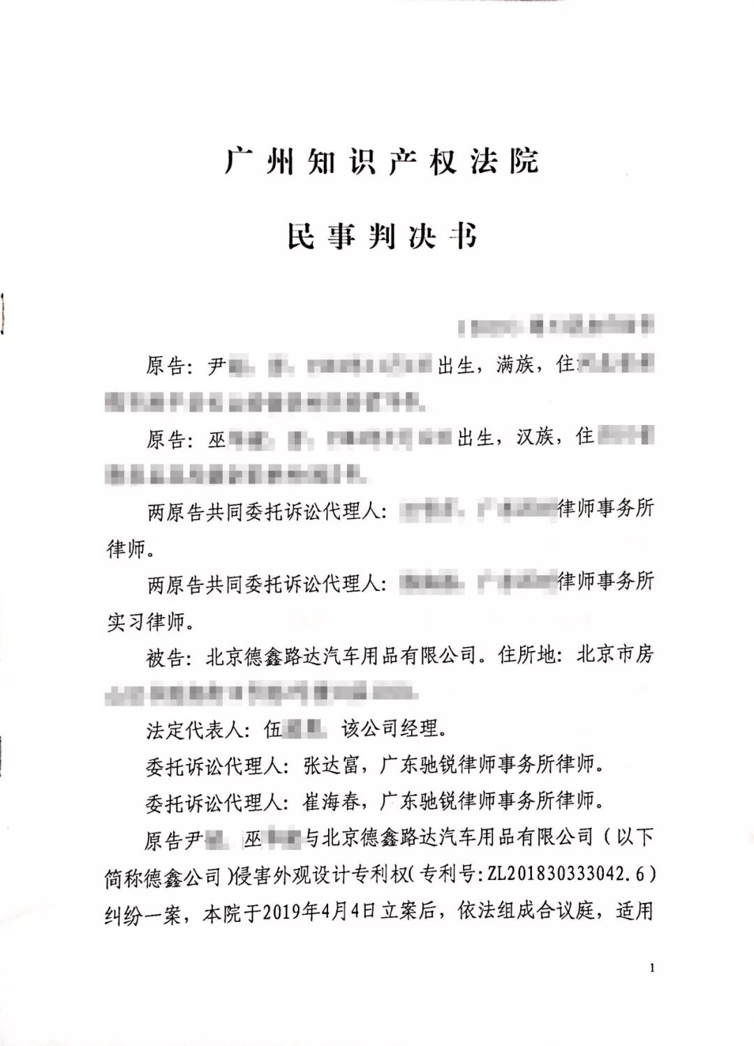 北京德鑫路达汽车用品有限公司因销售的产品涉嫌侵害他人外观设计专利权被诉,案件棘手,处理难度非常大,一旦败诉,将造成较大经济损失!为了打赢这场没有退路的官司,熊先生慕名找到驰锐所代理该案。