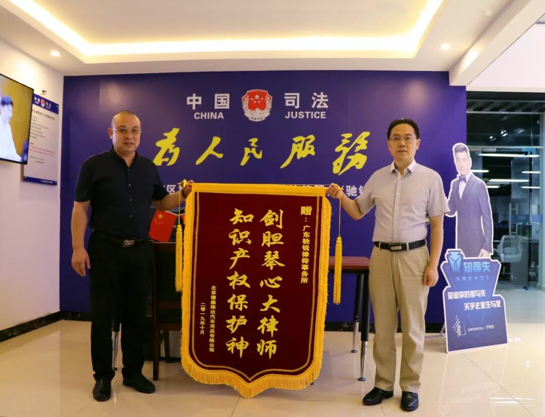 2019年10月28日,我所张达富律师、崔海春律师承办的专利侵权民事案件,因尽心尽责、诚信服务,北京德鑫路达汽车用品有限公司的负责人熊先生特地向广东驰锐律师事务所送来一面上书“剑胆琴心大律师,知识产权保护神”的锦旗以示感谢。