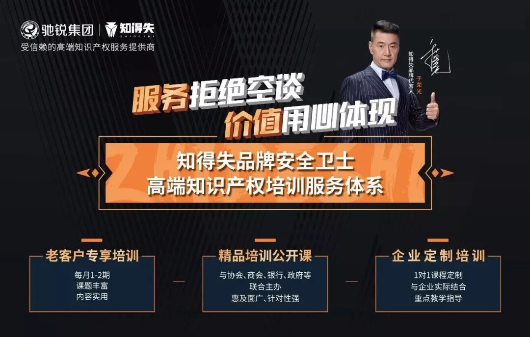 也正因如此,知得失品牌安全卫士的高端知识产权培训服务体系已经广泛延伸至国企、银行、商协会及广大中小型企业。